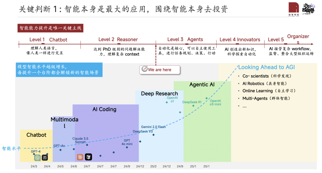 2023年来,随着 AI 研究的不断进步,AGI的发展叙事逐渐清晰:从处理单一 模态信息的单模态模型,到融合多种模态信息的多模态模型,再到以多模态模型为底模、能够自主规划和执行任务的Agent,发展到能与现实世界深度交互的具身智能、能探索前沿科学的 AI for Science(AI4S),最终达到 AGI。