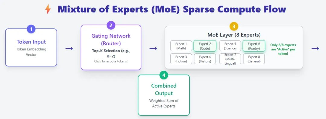 - 路由机制(Router):对于每一个输入的 Token,路由器会进行 Top-K 选择,仅激活最相关的少数几个专家来处理。