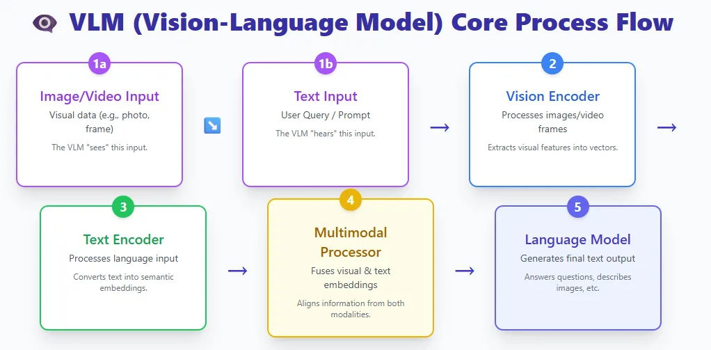 - 多模态处理器(Multimodal Processor):这是 VLM 的核心,它将视觉特征与文本特征在向量空间中对齐与融合,最终由语言模型生成输出。