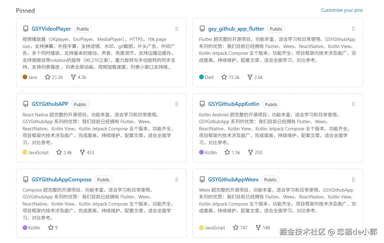 GSYGithubApp 诞生之初 Github 的官方客户端还没有出来,而当时因为做开源也有些时间,所以在日常中没有一个应用其实挺不方便,正好那时候刚学 React Native 没多久,所以 2017 年第一个 GSYGithubApp 就作为练手项目诞生了,之后陆续随着接触的技术栈变化,开源的版本也越来越多