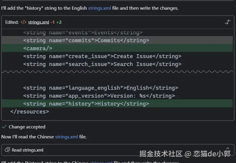 当然,最终代码还是需要人审核,咱也不懂,为什么它增加个多语言的时候,会删掉某个标签,加个 camera 做什么?