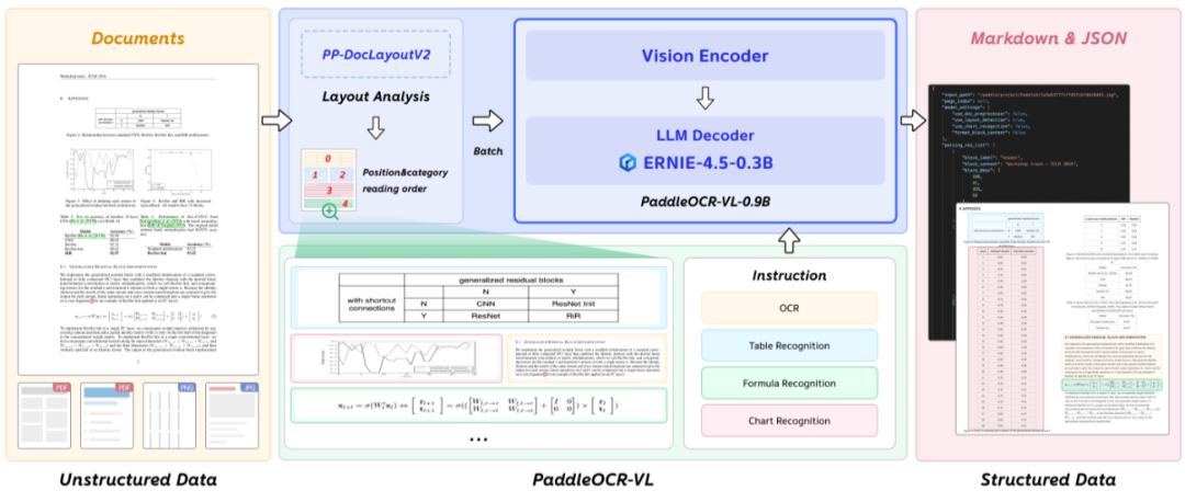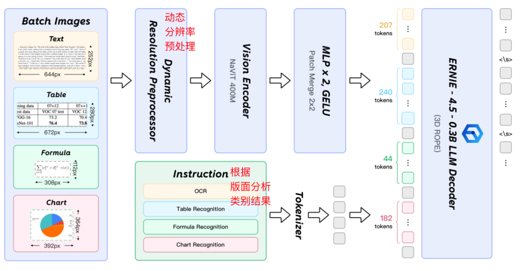 - 解码器:ERNIE-4.5–0.3B 语言模型,该模型规模虽小但速度很快,并且采用 3D-RoPE 进行位置编码。 最终模型输出结构化 Markdown 或 JSON 格式的文件用于后续的处理。