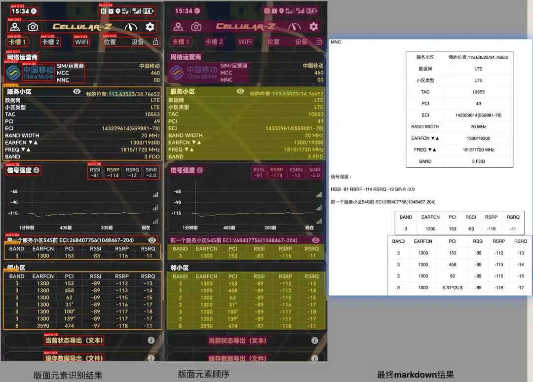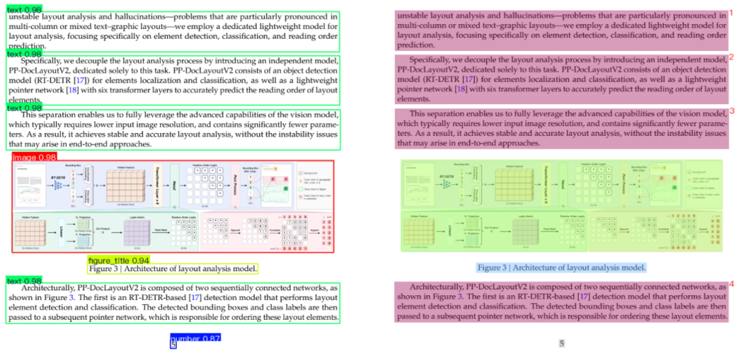 - **版面分析:**首先检测文本版面元素位置、类别、排序。