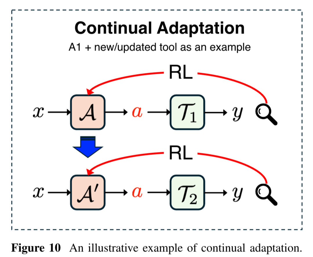**持续适应(Continual Adaptation)**针对的是真实世界的非平稳性。任务分布会随时间变化,工具会更新,用户需求会演进。如何让Agent持续学习新技能而不遗忘旧能力,是部署层面的核心难题。
