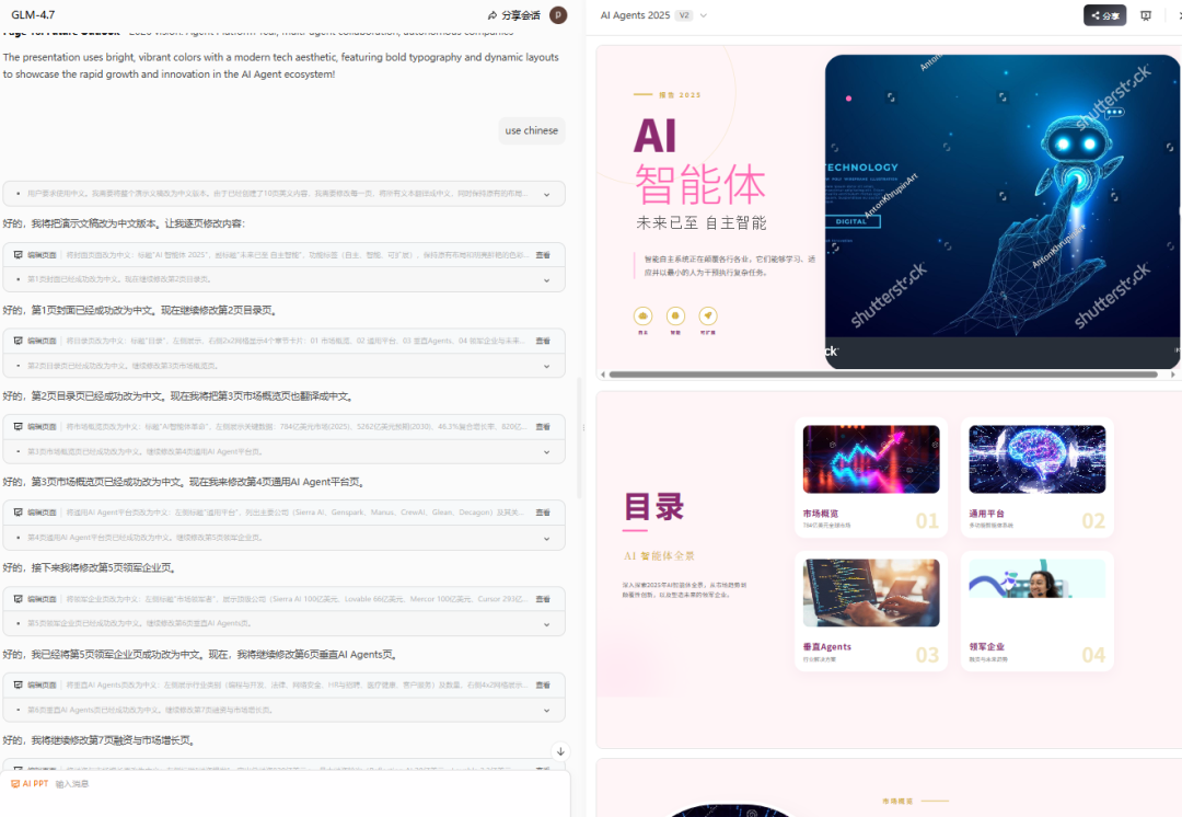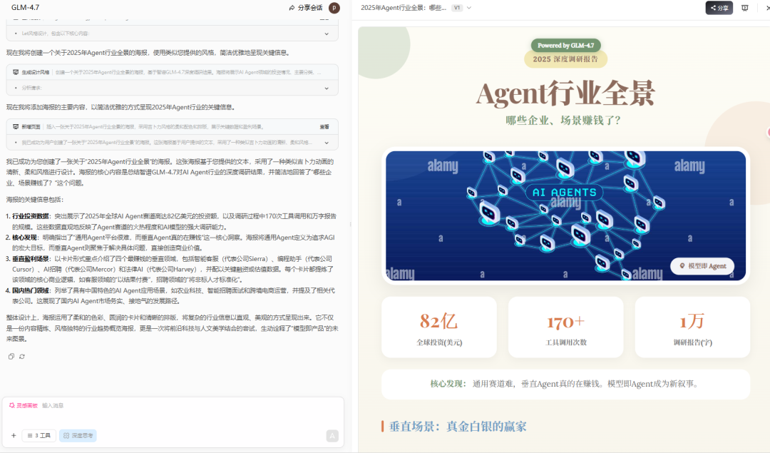 智谱GLM-4.7模型完成Agent行业调研,进行170+次搜索,整理100+家企业详细数据并自动生成结构化报告和精美PPT。模型展现出交错式、保留式和轮级思考能力,已能自主完成复杂任务,从ChatBot进化为真正的Agent。通过z.ai平台,用户可体验其AI PPT和海报生成能力,见证国内AI技术的飞速发展及特色落地应用。