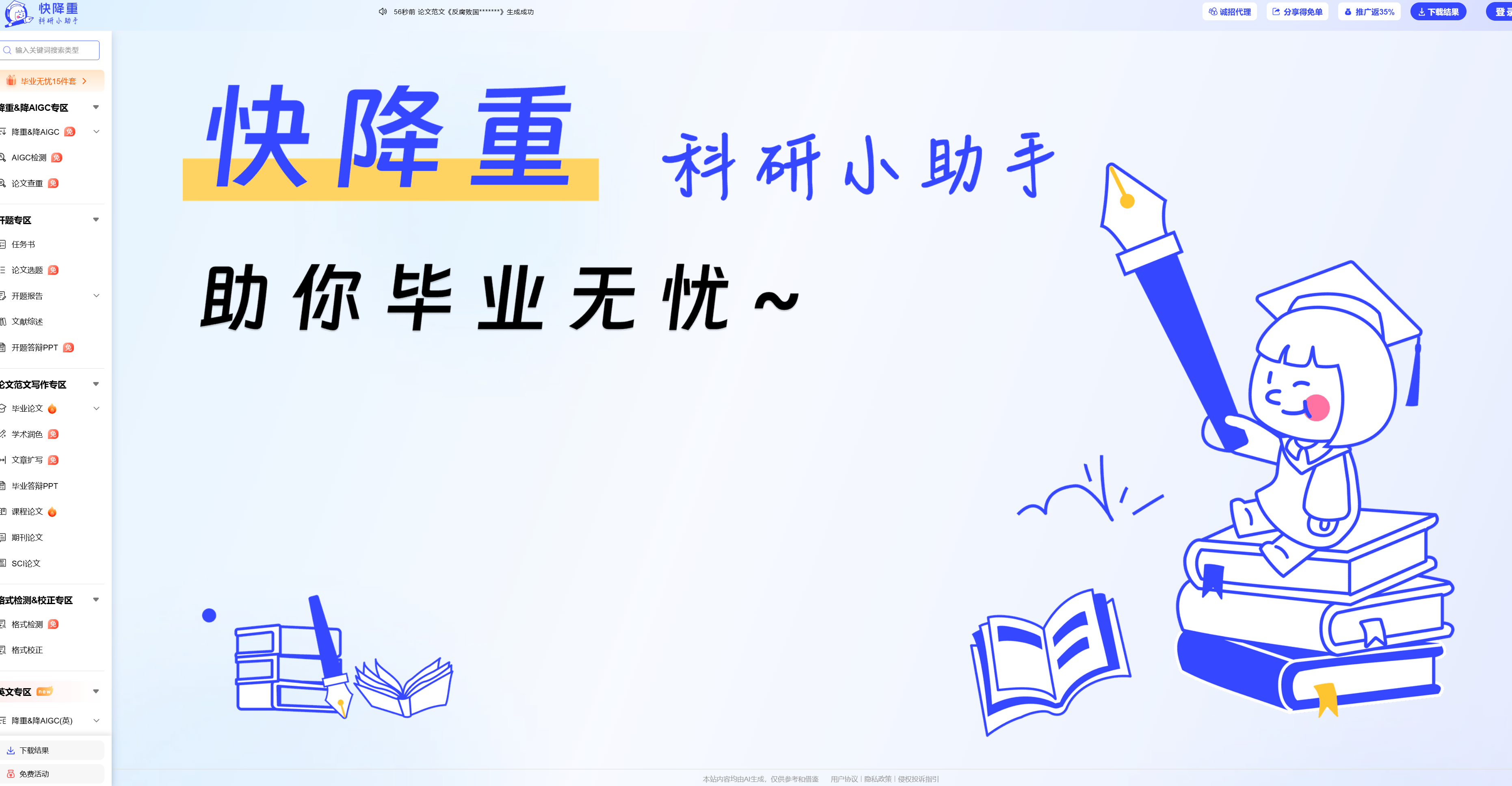 - 等待生成结果,下载后仅需微调个别表述,直接提交学校查重
