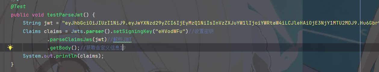 需要用到Jwts.parser()方法进行构建,在解析时只需要对应的密钥和jwt就行
