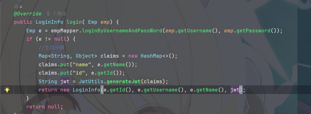 在登录接口的实现类中调用类中的方法,把null值改成jwt
