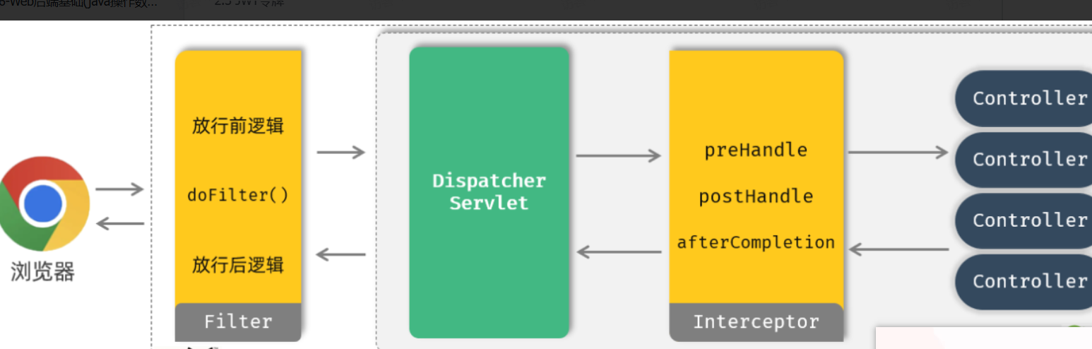 以上就是拦截器的执行流程。通过执行流程分析,大家应该已经清楚了过滤器和拦截器之间的区别,其实它们之间的区别主要是两点: