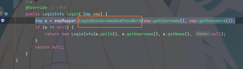 实现类中调用mapper方法中的函数需要见名知义,此时的token没有,暂时设为null