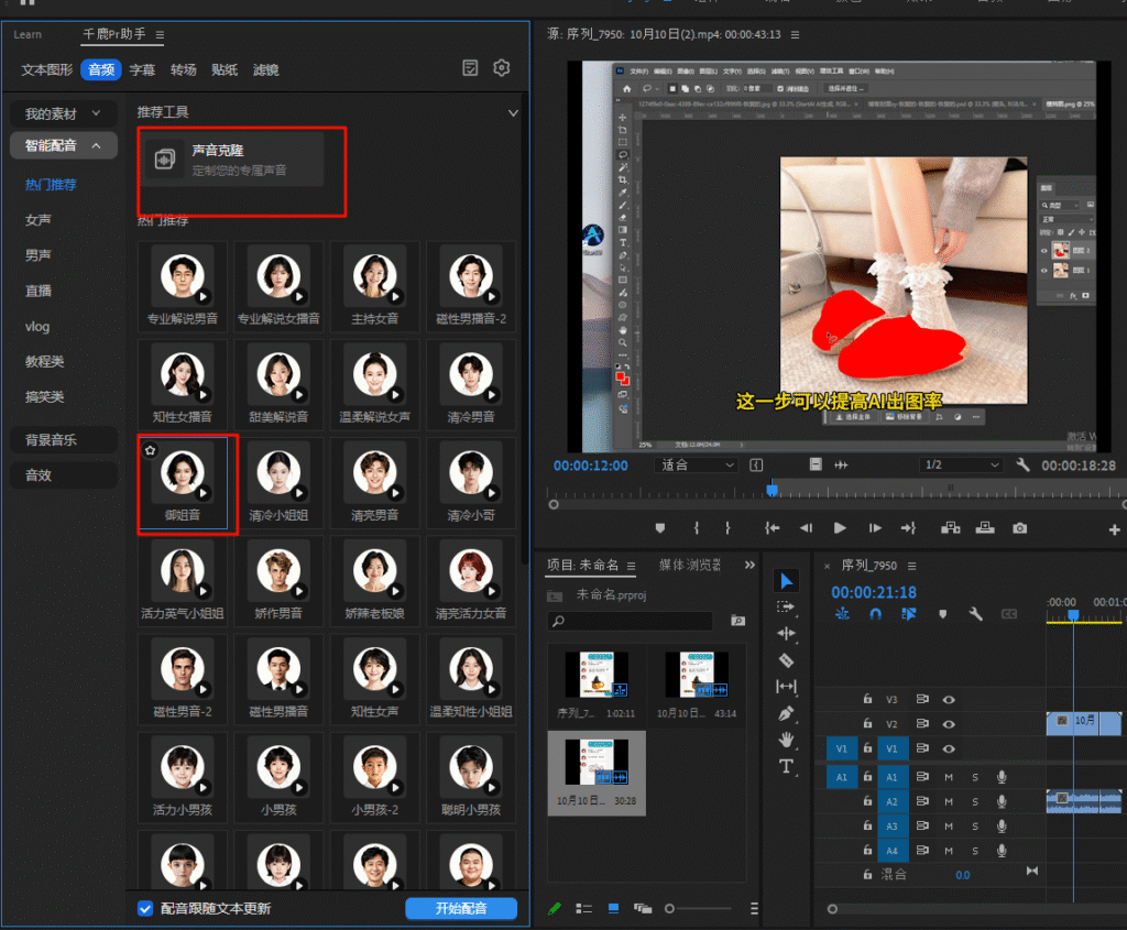 此外,千鹿PR助手还结合了AI技术,提供了AI字幕识别、配音、贴纸生成等功能,帮助你在视频剪辑中节省更多时间。通过千鹿PR助手插件,你可以更加专注于创意和设计,而不需要花费大量时间在繁琐的设置上。