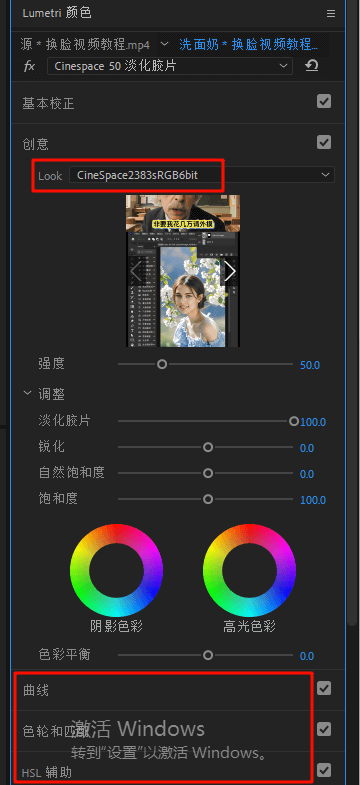 ②在“效果”面板中找到“Lumetri 颜色”,调整“RGB曲线”或者“色轮与匹配”滤镜。