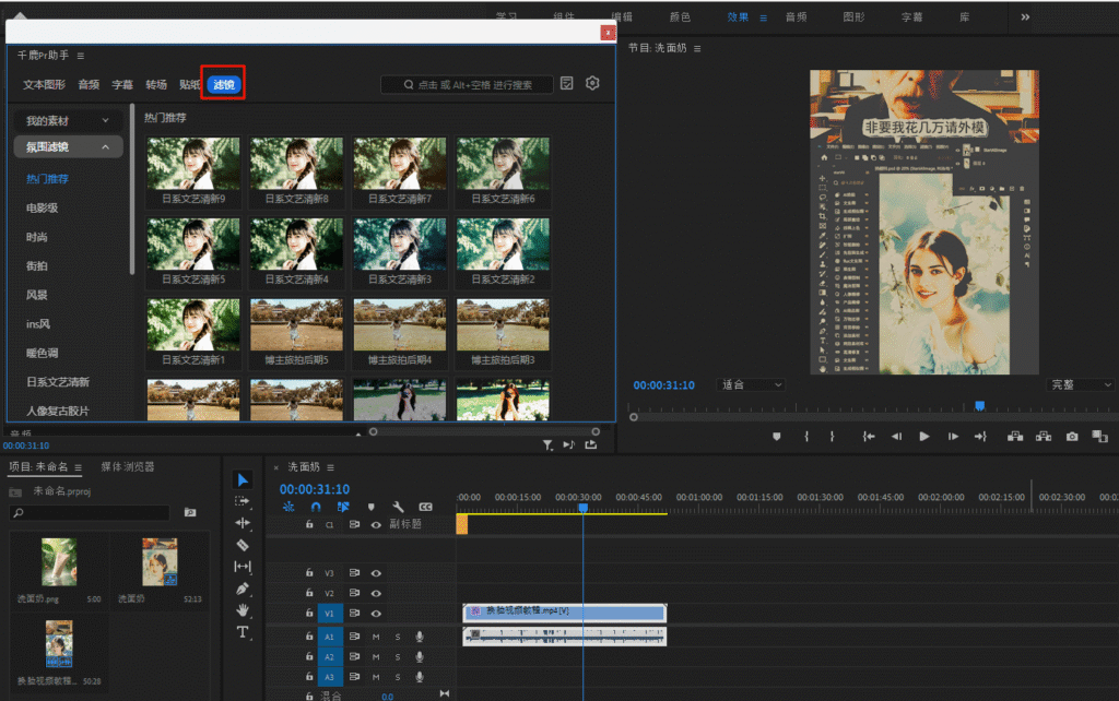 虽然PR自带了强大的滤镜功能,但如果你想提高工作效率并获得更多创意灵感,不妨试试千鹿PR助手插件。