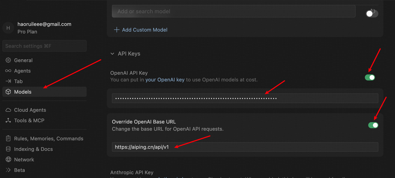 2. 配置AI Ping API:左侧栏点“Models”进入模型配置页,展开“API Keys”部分——勾选“Override OpenAI Base URL”,输入AI Ping调用地址:https://aiping.cn/api/v1,再把AI Ping的API Key填到OpenAI API Key输入框里;