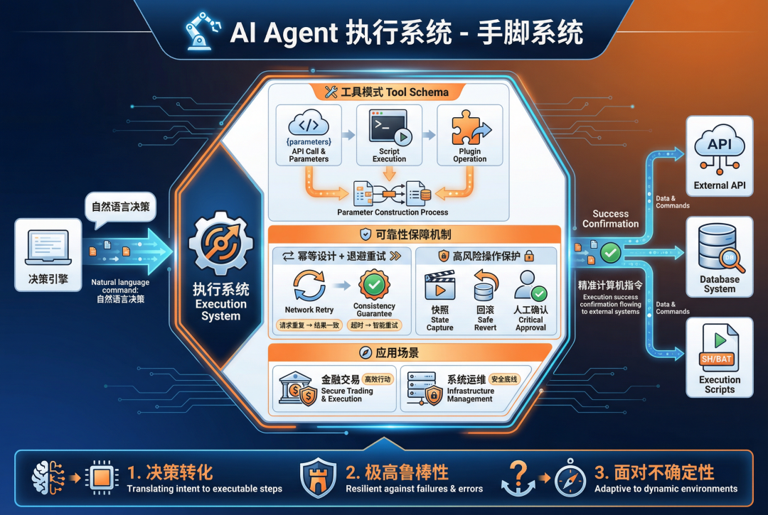 在 AI Agent 的架构中,执行不仅仅是简单的动作,而是将自然语言的决策转化为精准的计算机指令。