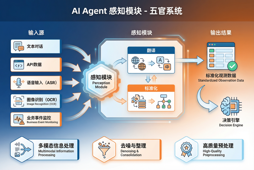 现实世界的信息是杂乱无章的,感知模块必须将这些非结构化的文本、图像以及实时监控到的业务事件(如订单异常、流量暴涨),转化为系统可理解的标准化观测数据。