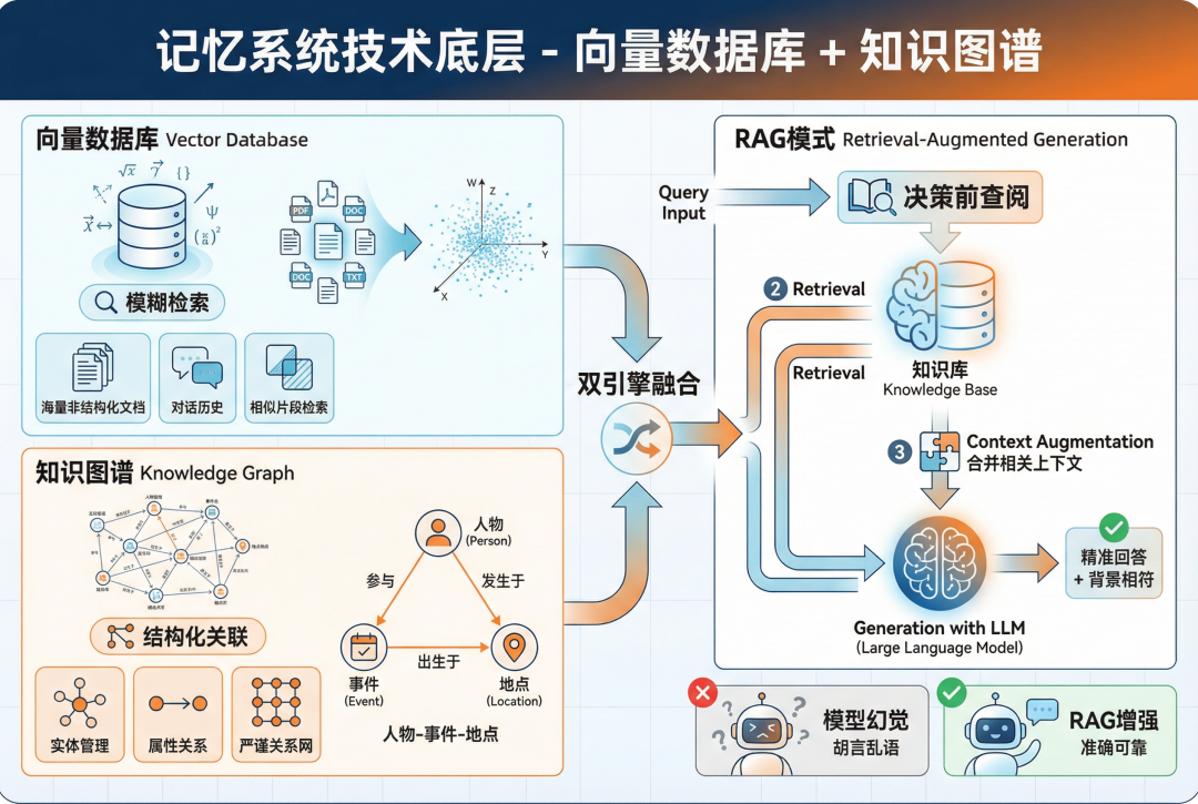 这种记忆系统实现了检索增强生成(RAG)模式,让智能体在做决策前能先查阅大脑中的知识库,从而给出更加精准且符合背景的回答,避免了模型由幻觉导致的胡言乱语。