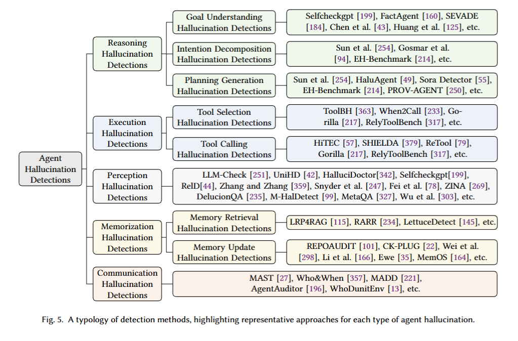 - 全面的综述:为每种类型的代理幻觉提供了形式化定义、示例和代表性研究的深入讨论,识别了十八个触发代理幻觉的原因,并总结了十种通用的幻觉缓解方法及其相应的检测方法。
