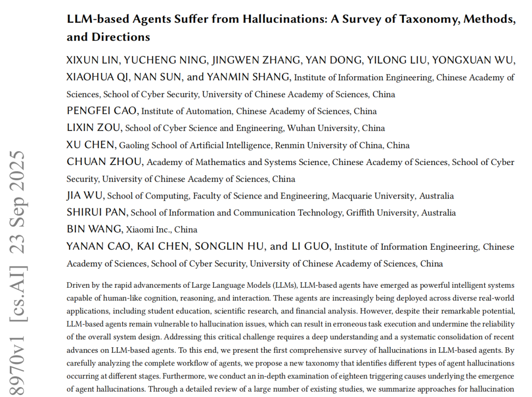 这篇文章全面综述了基于LLM的代理幻觉问题,创新性地将代理幻觉分为推理、执行、感知、记忆和通信五种类型,深入分析了十八种触发原因,并总结了十种有效缓解方法(知识利用、范式改进、事后验证等)。研究为理解LLM代理幻觉提供了系统框架,对开发更健壮可靠的智能体系统具有重要价值。