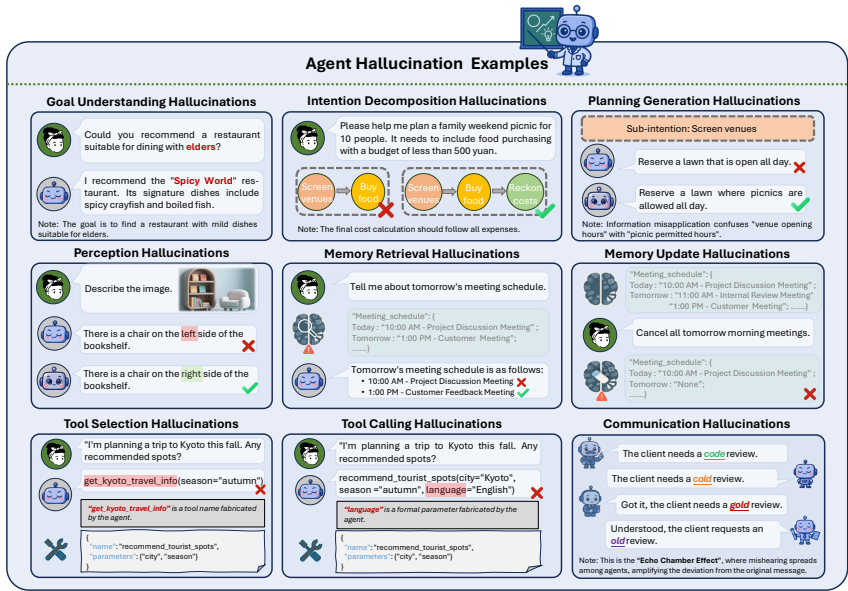 - 创新的分类体系:引入了将代理组件分为内部状态和外部行为的新分解方法,基于此可以基于特定阶段发生幻觉对代理幻觉进行分类,涵盖五种类型的代理幻觉。