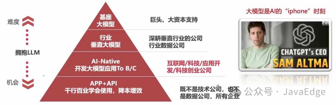 看右边,ChatGPT CEO创始人Sam Altman说大模型是AI的iPhone时刻,就是在打造这样一个生态圈,像苹果,我有自己的App Store和开发者工具。然后你只需要借助AI把你的创意变成相应的应用。所以说在这个时候其实是有大量的职业机会或大量应用开发的机会存在,也是说我们传统的应用开发者去快速转型跟上这个赛道的一个绝佳机会。