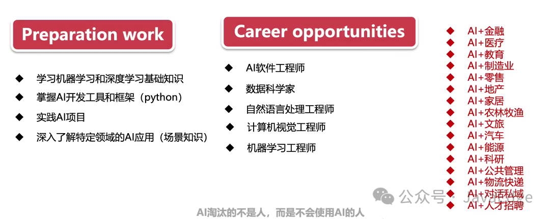 对于其他的一些部分,我们就要做到了解,那么从职业机会的角度来看的话,就是目前大量的这个行业和场景是需要 AI 应用的。那么,我们要做好一些提前的准备工作,就是在转型的时候,我们要做好准备工作,要做一些前置的知识学习。然后我们要学会使用 AI。