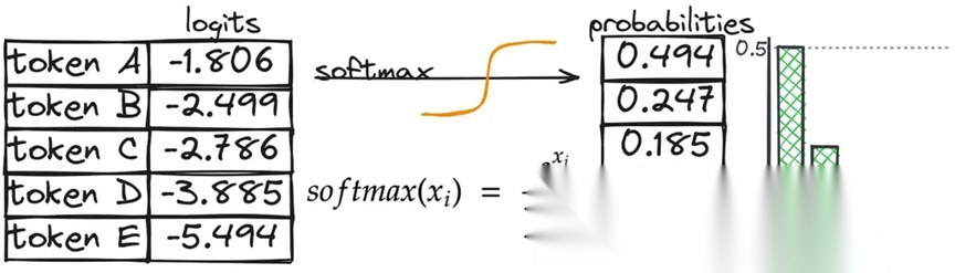 其中,token表示词元(可以简单理解为某个单词或字符的向量表示),logits表示逻辑值(可以理解为token的逻辑值),logits可以使用softmax函数转换生成token的概率(也就是把logits利用softmax变为概率值,用来表示某个token出现的概率)。