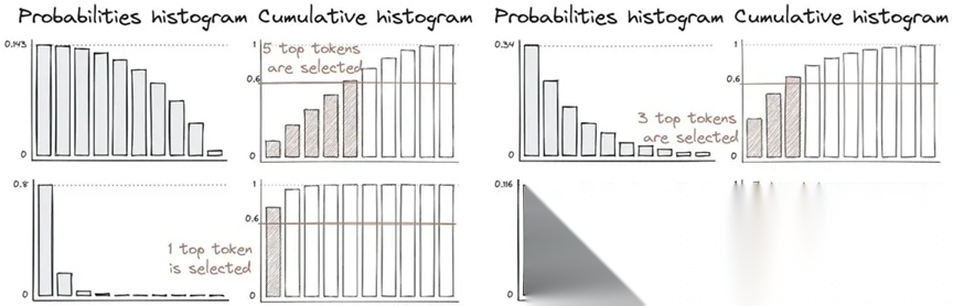 top-p采样不是指定一个固定的“k”个令牌数,而是使用一个概率阈值“p”。该阈值代表希望在采样中包括的累积概率。模型在每个步骤中计算所有可能令牌的概率,然后按照降序的方式对它们进行排序,直到它们的概率之和超过指定的阈值。