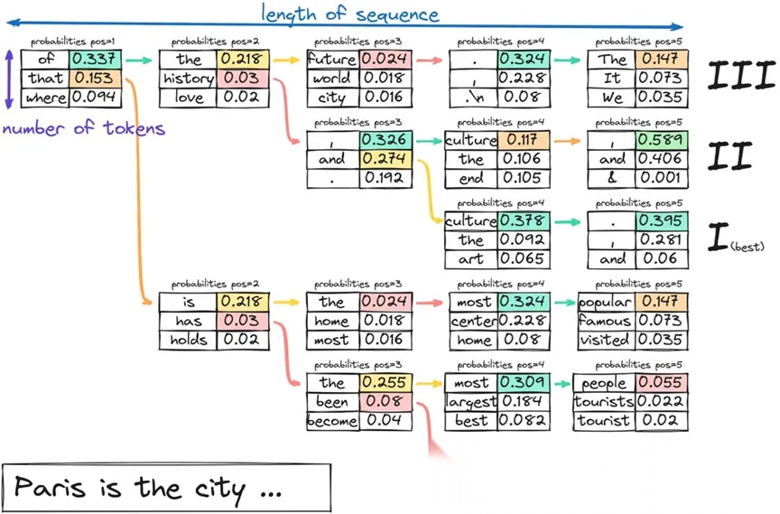 在beam搜索中,模型假设一组最有可能的前“k”个token,这组k个token被称为“beam”。模型通过为每个token生成可能的序列,并通过扩展每个beam在文本生成的每个步骤中跟踪它们的概率来生成可能的序列,直到达到生成文本的所需长度或者每个beam遇到一个“终止”标记。模型会从所有beam中选择具有最高整体概率的序列作为最终输出。从算法的角度来看,创建beam就是扩展一个k叉树。在创建beam之后,选择具有最高整体概率的分支作为最终输出。