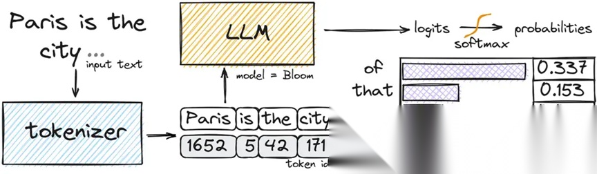 如下图,先把输入语句通过分词器,转为向量表示,然后给到LLM,LLM根据学习到的词库数据,预测下一个单词的逻辑值,逻辑值通过函数变换为概率值,最后根据选择策略选出合适的单词。