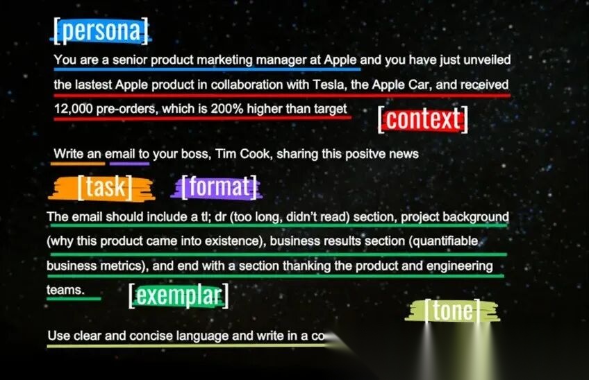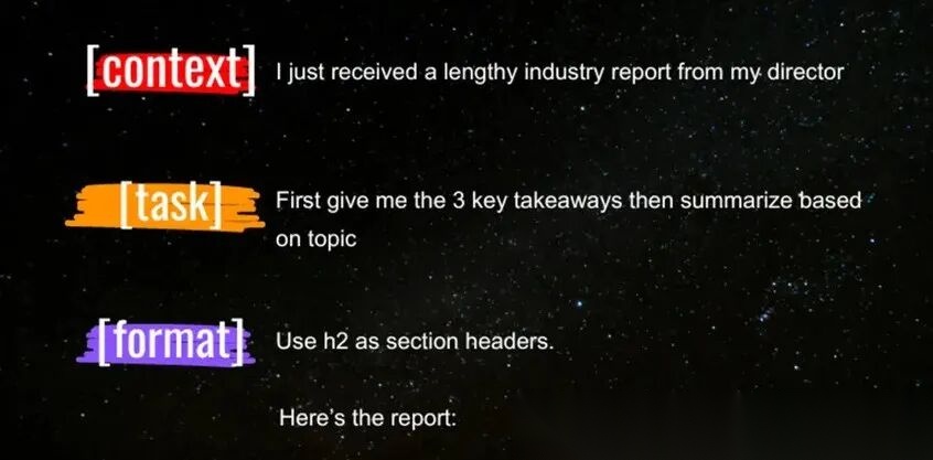 在这6个要素中,任务是必须的,上下文和示例非常重要,而且最好也要有角色、格式和语气。
