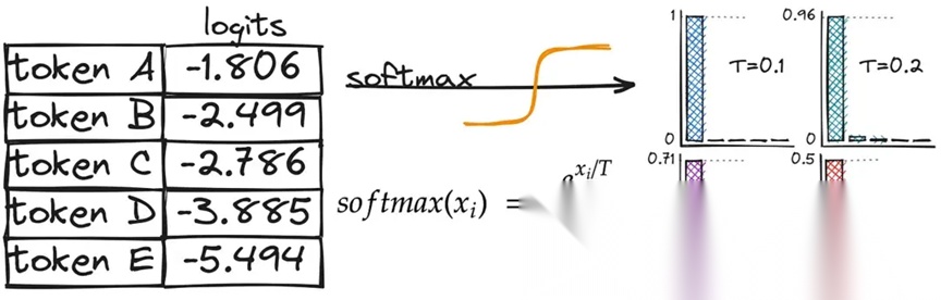 一般使用softmax函数将logit转换为概率。在这个时候,为随机采样引入了温度参数(一种影响文本生成随机性的超参数)。 在引入温度之后,与典型的softmax不同于分母除以了温度T。温度越高(趋向1)输出结果会更加多样化,而温度越低(趋向0),输出结果则更加集中并更具确定性。 当T = 1的时候,演变为最初使用的softmax函数。