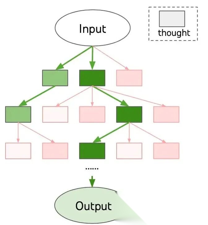 思维树(Tree of Thought)通过探索每一步的多种推理可能性来扩展 CoT。首先将问题分解为多个思维步骤,并在每个步骤中生成多个思维,实质上是创建一个树形结构。搜索过程可以是广度优先过程或深度优先的过程,而每个节点的评估分类器可以通过Prompt提示的方式完成。