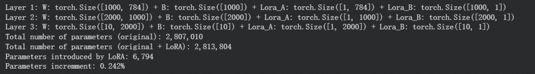 打印原始参数和添加LoRA参数的对比,LoRA占比仅0.242%。