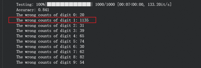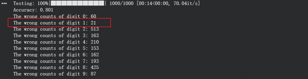 打印正确率,找到数字‘1’的错误个数,相比原模型明显降低了。