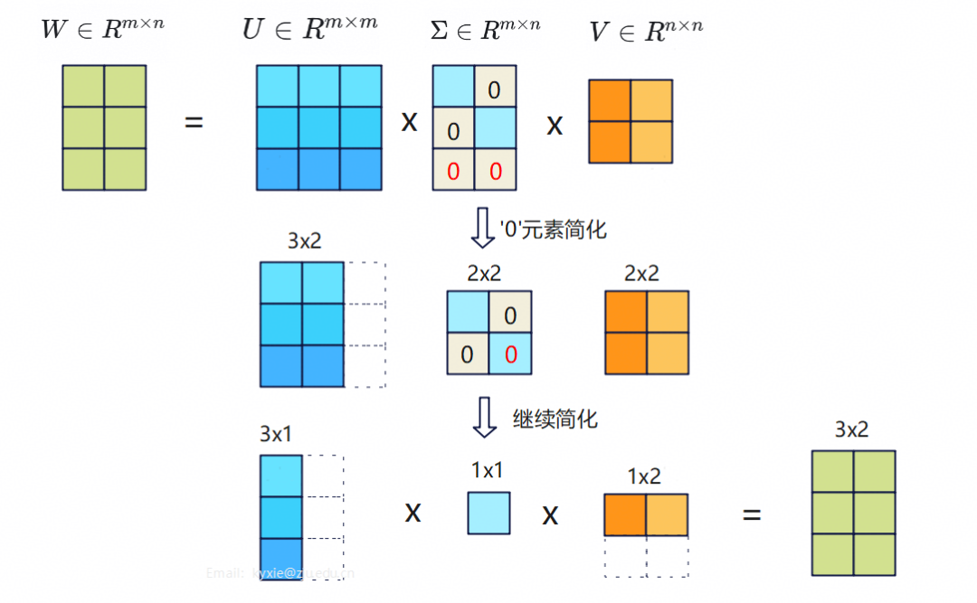 这里举个3x2矩阵分解的例子,如下图所示,将矩阵W进行SVD处理,得到分解矩阵。其中3x2的对角矩阵最后一行必为0,所以可以简化表达;进一步若还存在‘0’的对角元素,可以进一步简化。简化后的分解矩阵乘积依然等于原矩阵。