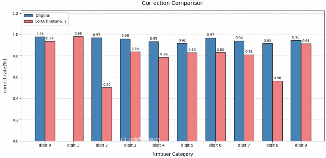- step5:测试LoRA模型,观测数据‘1’识别度差异。