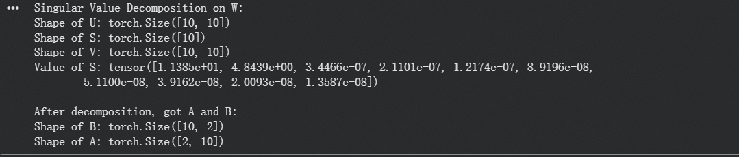 这里我们通过一个简单的乘法示例来验证分解矩阵的特点。先创建一个非满秩的矩阵W并进行SVD计算,接着建立B、A矩阵,最后定义一个乘加运算,对比原矩阵与分解矩阵的计算差异。