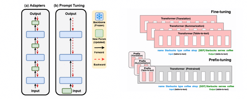 前缀调优(Prefix Tuning[4]):给Attention KV层中添加一个前缀,并只训练这个附加的前缀参数;类似的还有提示词调优(Prompt Tuning[5]);