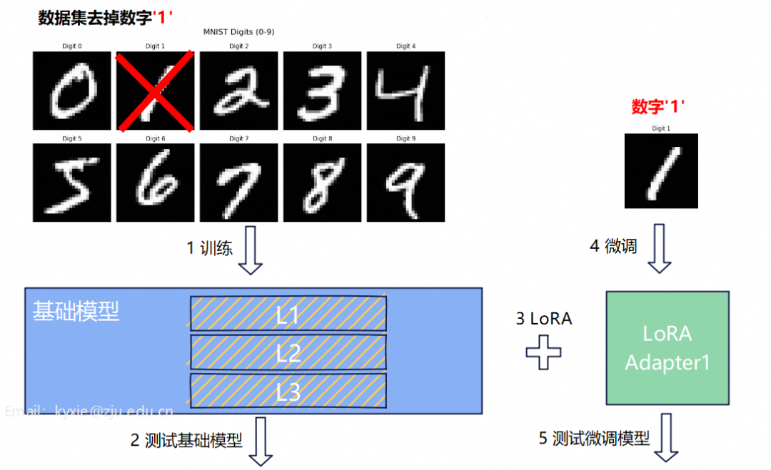 一个数字0~9手写体识别训练场景,数据采用MNIST。训练一个3层的MLP,让其具备数字手写体识别的能力。为了体现LoRA的作用,需要对数据集进行处理,先全量训练,再增加LoRA微调。大致步骤如下: