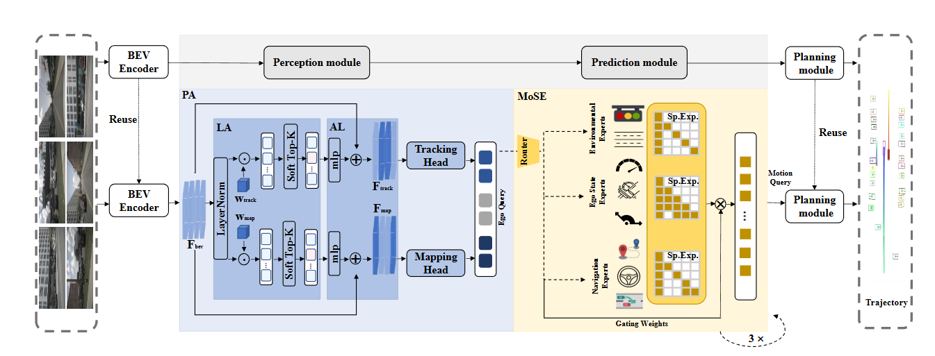 专家被划分为三类:环境感知专家、车辆状态专家、导航规划专家;每个专家都采用定制化的稀疏注意力机制,更高效、更稳定;路由器模块根据当前 ego query 自动决定激活哪几个专家,不再一股脑调所有模块,避免推理冲突。