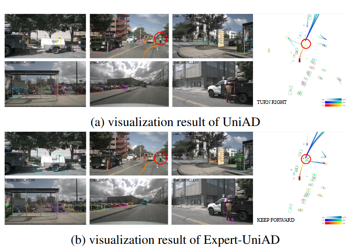 图6|左图:原始 UniAD 未能识别交警,车辆偏航进入危险区域;右图:ExpertAD 成功识别并及时调整轨迹,安全完成变道。该案例展示了 ExpertAD 在高风险场景中的感知敏锐度与快速响应能力