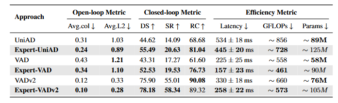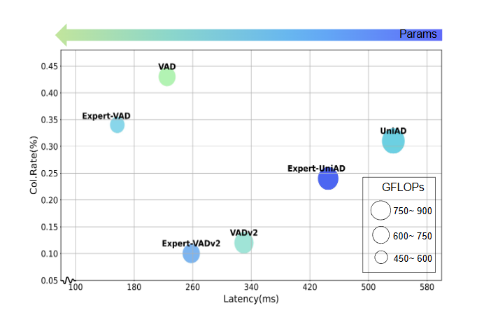 与原始 UniAD/VAD/VADv2 相比,ExpertAD 在不大幅增加模型参数的前提下,实现: