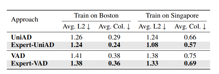 ● 碰撞率下降:在新加坡和波士顿的泛化测试中,ExpertAD 都比原模型碰撞率更低;