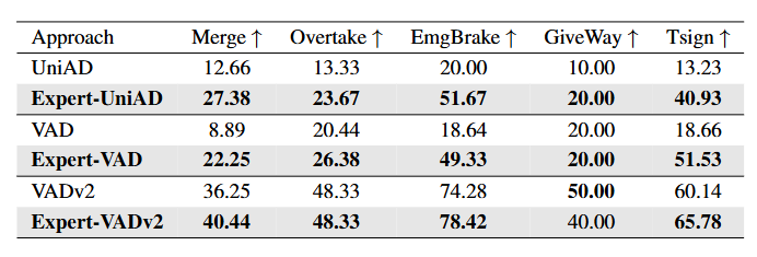 图2|MoSEs带来的在特殊驾驶技能场景下的表现:在并线、超车、识别交通标志等复杂场景中,ExpertAD 显著提升了成功率;而在紧急制动和避让等安全性场景中,也保持了稳定表现,展现出强大的多任务适应能力