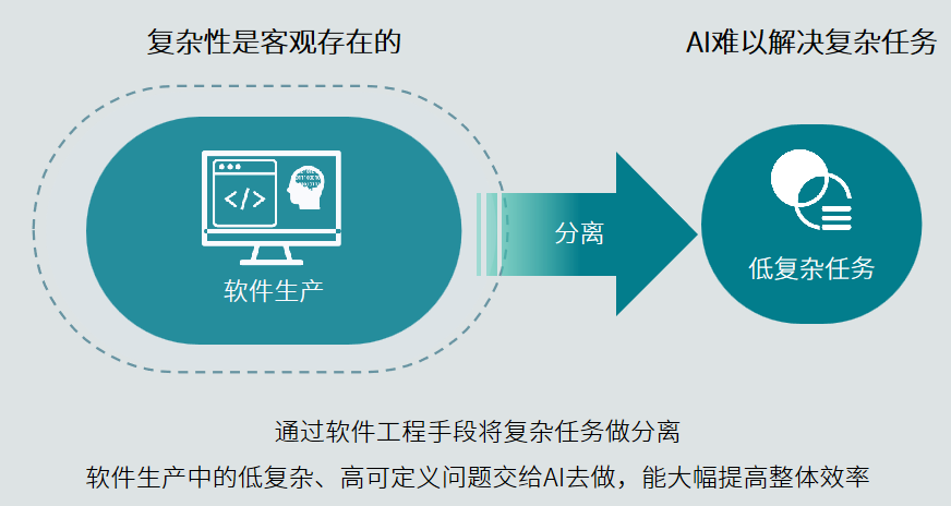 核心解决思路是纵向分层、横向分离。纵向分层指的是识别并拆分出高复杂任务与低复杂任务——将AI擅长的、劳力集中型的低复杂任务(如文档撰写、测试代码生成、代码调试等)交由模型处理;人类工程师则解放精力,聚焦高层次的结构设计和流程监督。横向分离是指确定人与AI分工后,进一步通过软件工程手段切割任务边界,明确每一步的输入和输出。比如采用简易版Spec模式模拟“需求-设计-实施-落地”流程,或通过工作流编排工具构建多轮审批/循环迭代的复杂流程。
