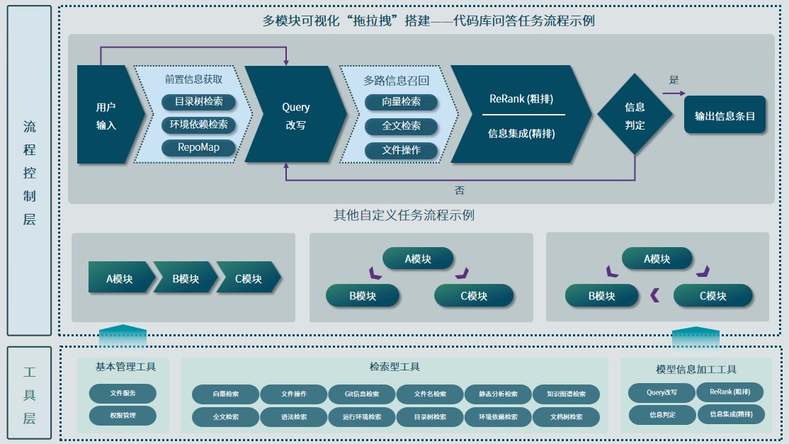 - 上下文工程:在提示词基础上,引入进阶的上下文工程,打造领域化程序分析平台。通过成熟的软件工程工具,将Git提交历史、代码仓库结构、项目文档、领域知识等多元信息,转化为高质量上下文提供给AI,让AI像人类工程师一样“查阅参考资料”,大幅提升代码生成准确率。