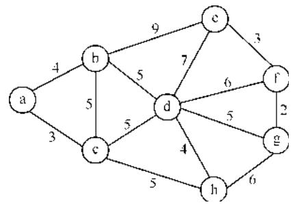 - 选最小边 a-d (1),U={a、d},V-U={b、c、e},新增边权:d-c (2)、d-e (3);