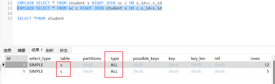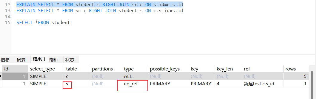而内连接的执行计划中,rows、type等核心字段与上述右连接完全一致,说明优化器判定两者的“有效数据扫描范围”相同,最终结果自然一致。