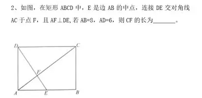 因此,△AEF∼△CDF(两角对应相等,三角形相似)。 步骤 3:利用相似比求 CF 相似三角形的相似比为:CDAE=84=21 由相似三角形的性质,对应边成比例:CFAF=CDAE=21⟹CF=2AF 步骤 4:结合 AC 长度求 CF 因为 AC=AF+CF=10,代入 CF=2AF 得:AF+2AF=10⟹3AF=10⟹AF=310 因此:CF=2×310=320 最终结论 CF 的长为 320(或约 6.67)。